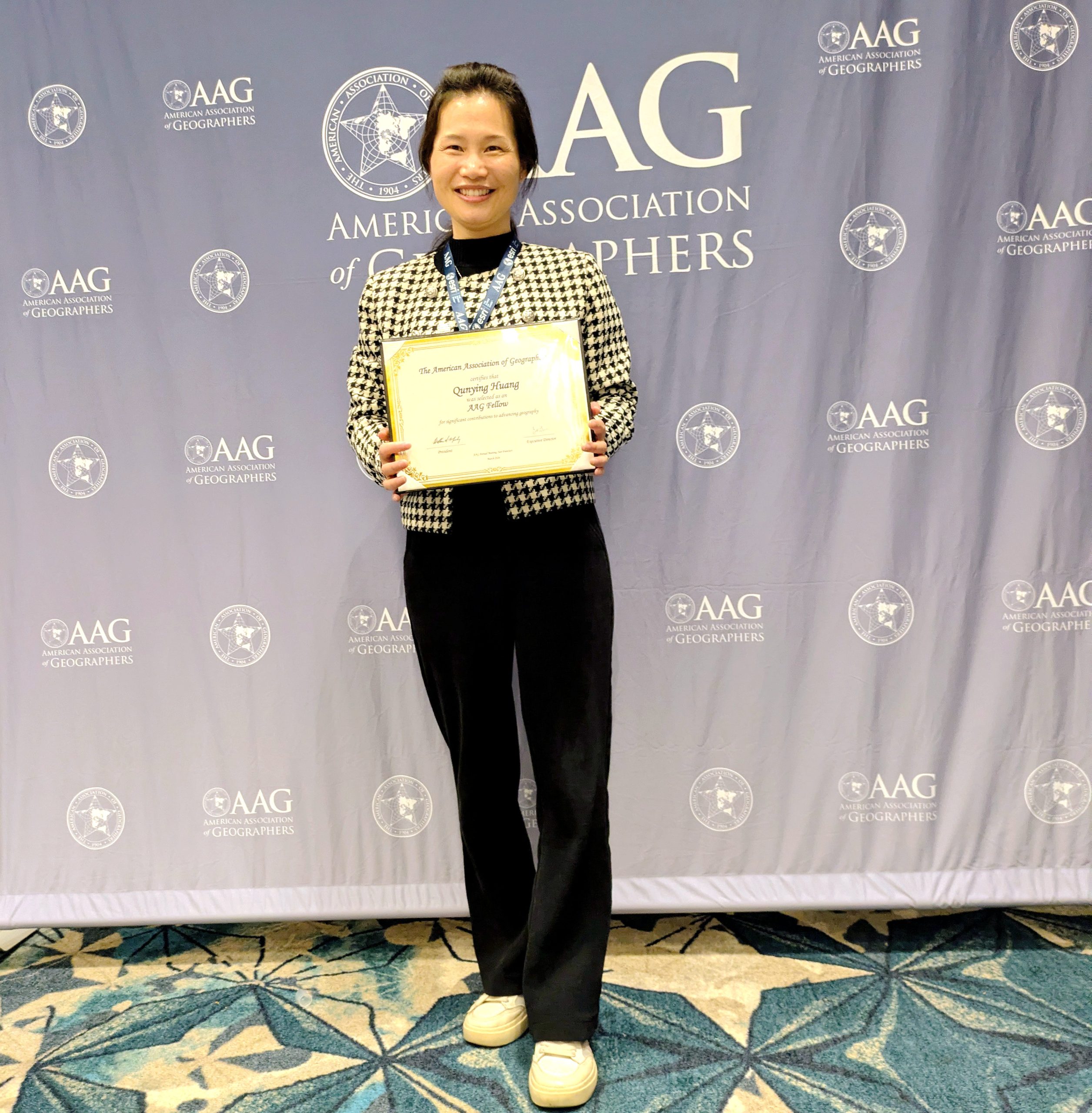 Congratulations to Dr. Huang on being named a Fellow of the American Association of Geographers (AAG), an honor that acknowledges geographers who have made meaningful contributions to advancing the discipline. This year, Dr. Huang is one of twelve geographers worldwide to receive this recognition. The AAG Fellows program highlights the dedication and service of geographers in research, teaching, and community engagement. Dr. Huang is deeply humbled by this recognition and grateful for the support of her colleagues, mentors, and the broader geography community, whose guidance and collaboration have been invaluable throughout her career.